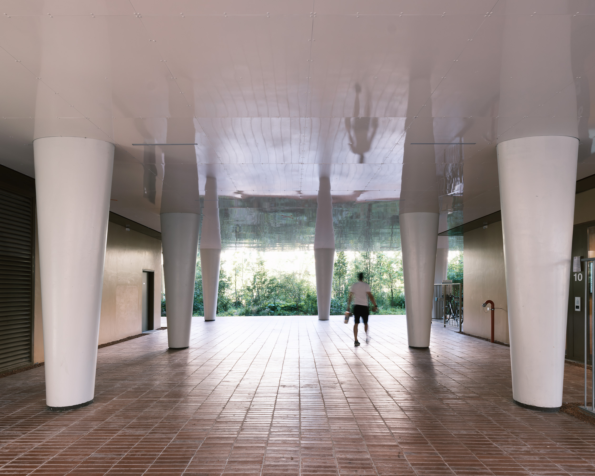 L’idée d’espace commun se développe aussi au rez-de-chaussée sur la place publique centrale, qui abrite un bâtiment suspendu unique en son genre. L’espace public émerge entre les fins poteaux de soutien de la structure où apparaissent diverses interactions et utilisations, créant un espace actif sous le projet. Un bar se cache au-dessus, dans un nuage suspendu. Les habitants peuvent y admirer les motifs scintillants créés par la structure tout au long de la journée, et profiter d’une atmosphère plus intime le soir venu. Un restaurant panoramique émerge du « nuage » dans une ambiance chaleureuse et boisée. La façade vitrée peut être entièrement ouverte, permettant au paysage environnant de traverser cet espace.